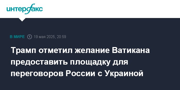 Москва. 19 мая. INTERFAX.RU - Президент США Дональд Трамп напомнил, что Ватикан готов организовать у себя переговоры РФ и Украины по завершению украинского конфликта.