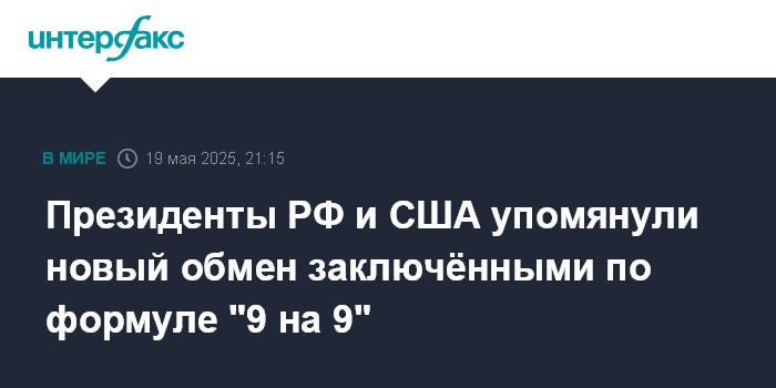Москва. 19 мая. INTERFAX.RU - Президенты РФ и США Владимир Путин и Дональд Трамп в телефонном разговоре в понедельник упомянули новый обмен заключёнными по формуле девять на девять человек, сообщил журналистам помощник президента РФ Юрий Ушаков.