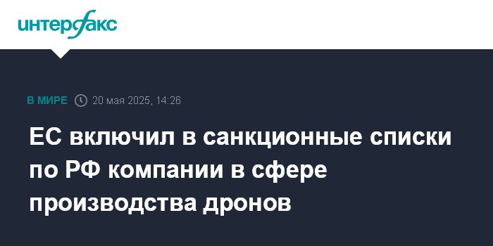Москва. 20 мая. INTERFAX.RU - ЕС добавил в санкционные списки по России ряд компаний, связанных с созданием беспилотников, говорится в публикации официального журнала ЕС.