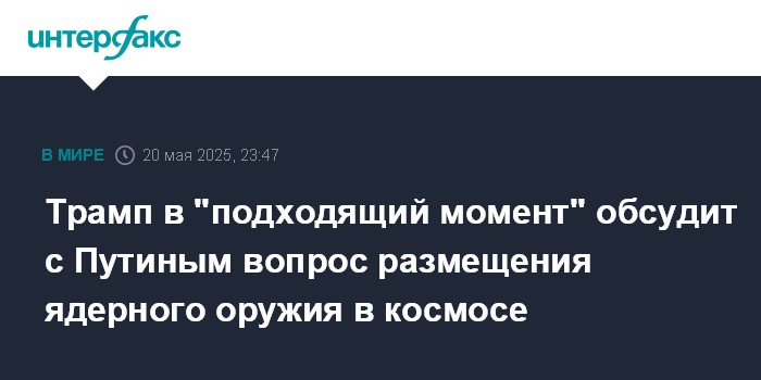 Москва. 20 мая. INTERFAX.RU - Президент США Дональд Трамп заявил, что пока не обсуждал с российским коллегой Владимиром Путиным вопросы, связанные с риском размещения ядерного оружия в космосе, но намерен поднять этот вопрос в будущем.