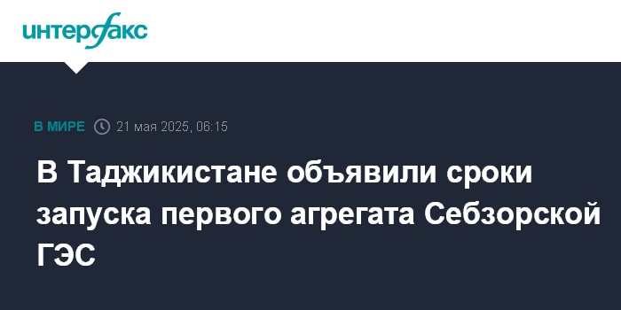 Москва. 21 мая. INTERFAX.RU - Ввод в эксплуатацию первого агрегата Себзорской ГЭС мощностью 3,6 МВт состоится в июне 2025 года, об этом было объявлено в ходе рабочей поездки министра энергетики и водных ресурсов Таджикистана Далера Джума в Рошткальский район Горно-Бадахшанской автономной области.