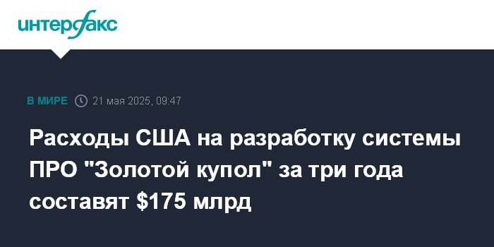 Москва. 21 мая. INTERFAX.RU - Расходы на разрабатываемую американскую систему противоракетной обороны "Золотой купол" (Golden Dome) в предстоящие три года составят $175 млрд, заявил в Белом доме президент США Дональд Трамп.