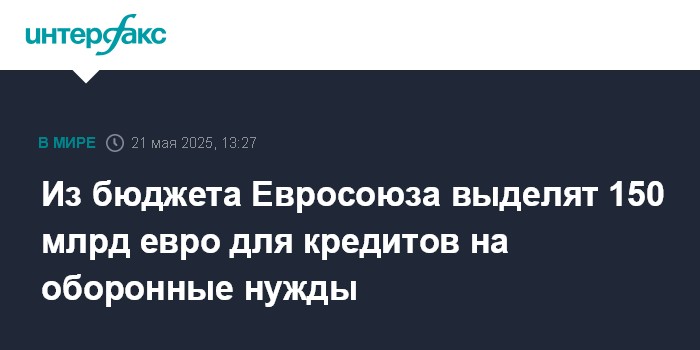 Москва. 21 мая. INTERFAX.RU - Власти Евросоюза утвердили программу кредитования обороны ЕС на сумму 150 млрд евро, заявил председатель Европейского совета Антониу Кошта.