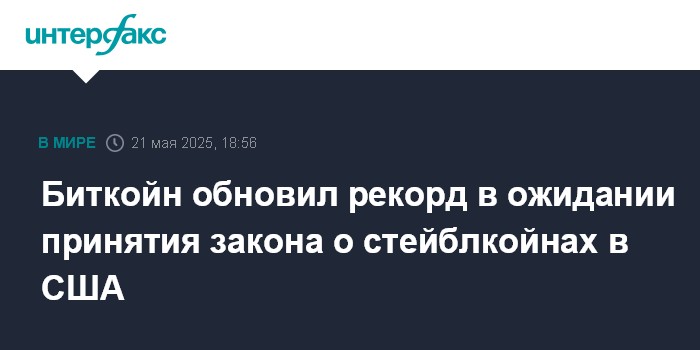 Москва. 21 мая. INTERFAX.RU - Курс биткойна на торгах в среду обновил исторический максимум на ожиданиях принятия закона о стейблкойнах в США.