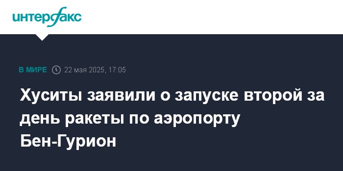 Москва. 22 мая. INTERFAX.RU - Йеменские хуситы заявили о запуске второй за день ракеты по аэропорту имени Бен-Гуриона в Тель-Авиве.