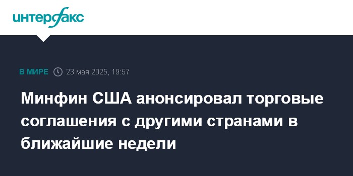 Москва. 23 мая. INTERFAX.RU - Министр финансов США Скотт Бессент ожидает объявления торговых сделок США с другими странами до окончания 90-дневной приостановки действия представленных 2 апреля американских зеркальных пошлин.