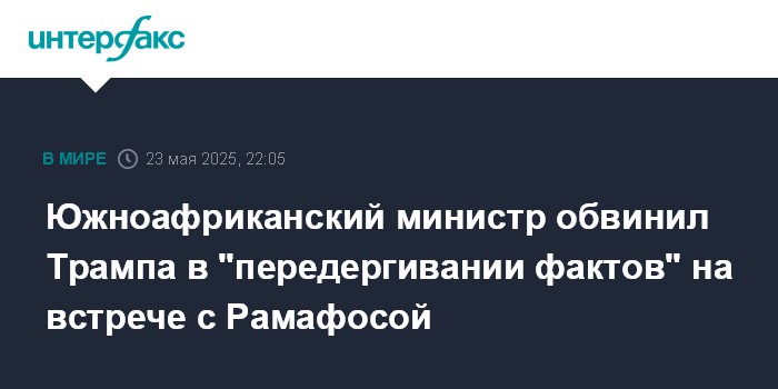 Москва. 23 мая. INTERFAX.RU - Президент США Дональд Трамп на встрече с южноафриканским президентом Сирилом Рамафосой излагал неверную информацию о массовых убийствах белых людей в ЮАР, заявил министр ЮАР по делам полиции Сензо Мчуну. Об этом сообщает АР.