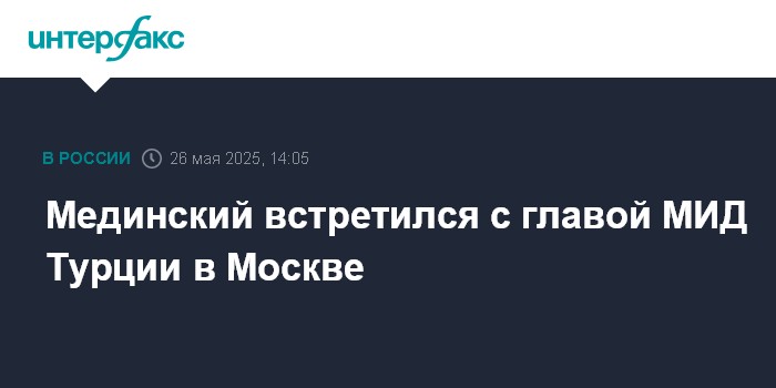 Москва. 26 мая. INTERFAX.RU - Глава МИД Турции Хакан Фидан встретился в Москве с помощником президента России Владимиром Мединским в рамках своего двухдневного визита в российскую столицу, сообщили турецкие СМИ со ссылкой на МИД республики.