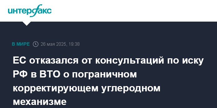 Москва. 26 мая. INTERFAX.RU - ЕС отказался от консультаций по иску России во Всемирную торговую организацию по вопросу пограничного корректирующего углеродного механизма (ПКУМ), говорится в заявлении ЕС, опубликованном на сайте ВТО.