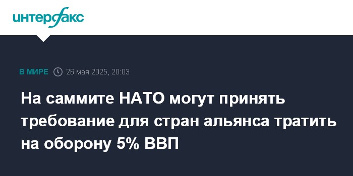 Москва. 26 мая. INTERFAX.RU - Участники саммита НАТО, который пройдет с 24 по 26 июня, могут одобрить показатель оборонных трат для стран альянса в 5% от их ВВП, заявил в понедельник генсек альянса Марк Рютте.