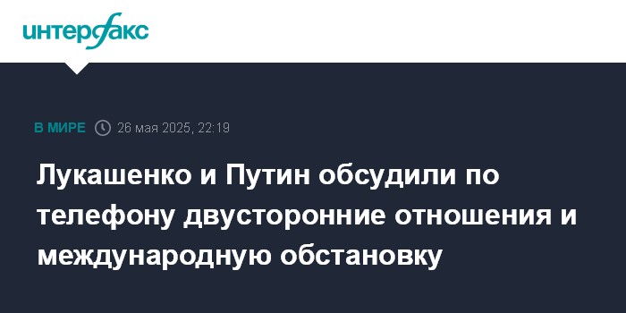 Москва. 26 мая. INTERFAX.RU - Президенты Белоруссии и России Александр Лукашенко и Владимир Путин в понедельник вечером провели телефонный разговор, обсудили двустороннюю и международную повестки, сообщил близкий к пресс-службе белорусского лидера телеграм-канал "Пул Первого".