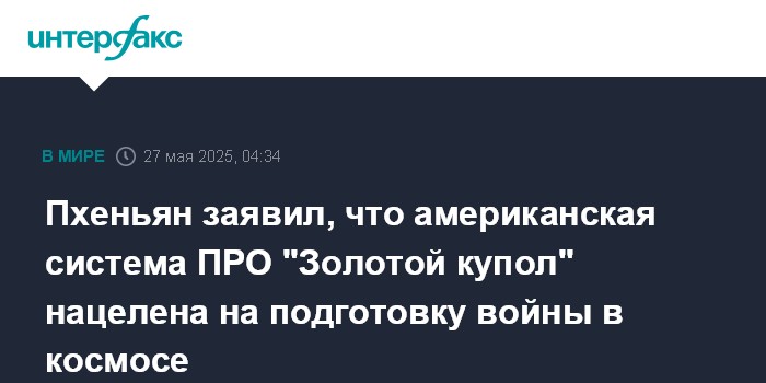 Москва. 27 мая. INTERFAX.RU - Создание Соединенными Штатами системы ПРО "Золотой купол" вызывает тревогу ядерных государств в сфере безопасности и превращает космос в потенциальное поле ядерной войны, говорится в заявлении Института по делам США при МИД КНДР, распространенном во вторник Центральным телеграфным агентством Кореи (ЦТАК).