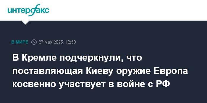 Москва. 27 мая. INTERFAX.RU - Европа, поставляя оружие Киеву, косвенно участвует в войне против России, и это не способствует мирному урегулированию украинского кризиса, заявил пресс-секретарь президента РФ Дмитрий Песков.