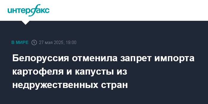 "Беларусь ответила на очередные санкции ЕС. Европейский парламент 22 мая 2025 года одобрил проект решения о введении повышенных таможенных пошлин на ввоз в ЕС сельскохозяйственной продукции из нашей страны. В ответ правительство сняло запрет на ввоз и реализацию на территории Республики Беларусь картофеля, лука репчатого, капусты свежей белокочанной, яблок, происходящих из недружественных стран, включая все государства-члены ЕС", - говорится в сообщении.
