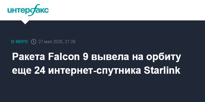 Москва. 27 мая. INTERFAX.RU - Ракета-носитель Falcon 9 успешно вывела на орбиту партию из 24 мини-спутников для пополнения орбитальной группировки глобальной сети интернет-покрытия системы Starlink, сообщила компания-разработчик SpaceX.
