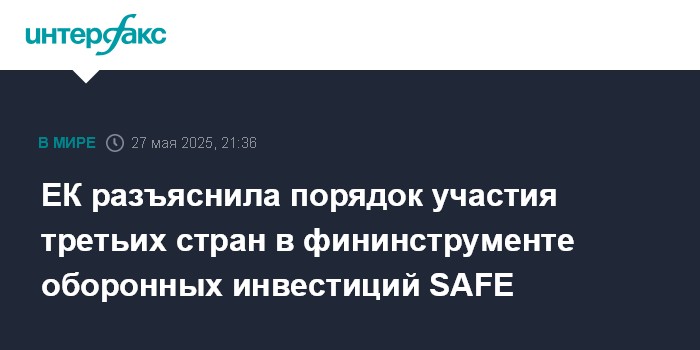 Москва. 27 мая. INTERFAX.RU - Новый финансовый инструмент ЕС в 150 млрд евро для поддержки инвестиций в оборонное промышленное производство допускает участие третьих стран, если они не представляют угрозы для безопасности Евросоюза, заявил на брифинге в Брюсселе пресс-секретарь Еврокомиссии Тома Ренье.