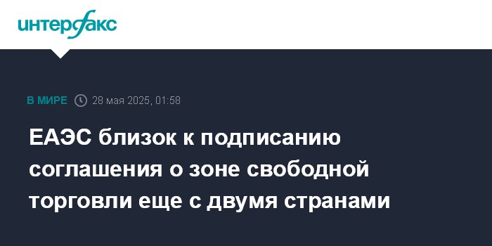Москва. 28 мая. INTERFAX.RU - Евразийский экономический союз (ЕАЭС) близок к подписанию соглашения о зоне свободной торговли еще с двумя государствами, сообщил заместитель председателя правительства РФ Алексей Оверчук в интервью, опубликованном в среду в "Российской газете".