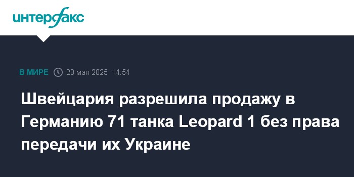 Москва. 28 мая. INTERFAX.RU - Власти Швейцарии объявили, что не имеют возражений против продажи в Германию 71 танка Leopard 1 A5, принадлежащих швейцарской компании RUAG MRO.