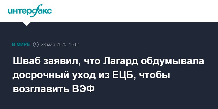 Москва. 28 мая. INTERFAX.RU - Президент Европейского центрального банка (ЕЦБ) Кристин Лагард обсуждала возможность досрочного ухода со своего поста с целью возглавить Всемирный экономический форум (ВЭФ) с основателем ВЭФ Клаус Швабом.