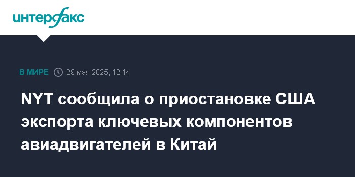 Москва. 29 мая. INTERFAX.RU - Администрация президента США Дональда Трампа приостановила экспорт критически важных компонентов авиадвигателей и сопутствующих технологий в Китай. Об этом пишет The New York Times со ссылкой на информированные источники.