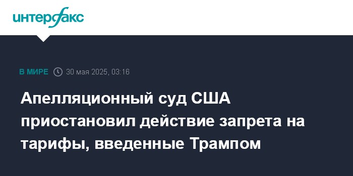 Москва. 30 мая. INTERFAX.RU - Федеральный апелляционный суд в четверг разрешил президенту США Дональду Трампу продолжать взимать пошлины в соответствии с законом о чрезвычайном положении, приостановив действие запрета Федерального суда по вопросам международной торговли, сообщило агентство Associated Press (АР).