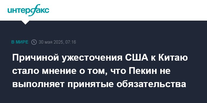 Москва. 30 мая. INTERFAX.RU - Принятые администрацией президента США Дональда Трампа в последнее время меры в отношении Китая объясняются тем, что в Вашингтоне считают, что Пекин уклоняется от выполнения договоренностей, достигнутых на недавних торговых переговорах в Женеве, сообщает CNN со ссылкой на источники.