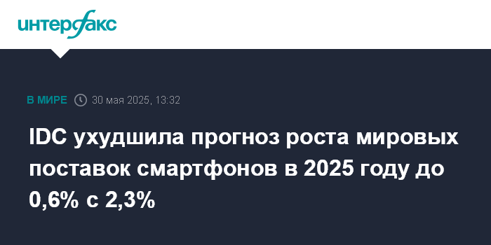 Москва. 30 мая. INTERFAX.RU - International Data Corporation (IDC) ухудшила прогноз роста мировых поставок смартфонов по итогам 2025 года до 0,6% с февральской оценки 2,3%.