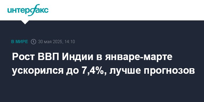 Москва. 30 мая. INTERFAX.RU - Экономика Индии в четвертом финансовом квартале (январь-март 2025 года) выросла на 7,4% в годовом выражении, говорится в отчете министерства статистики страны.