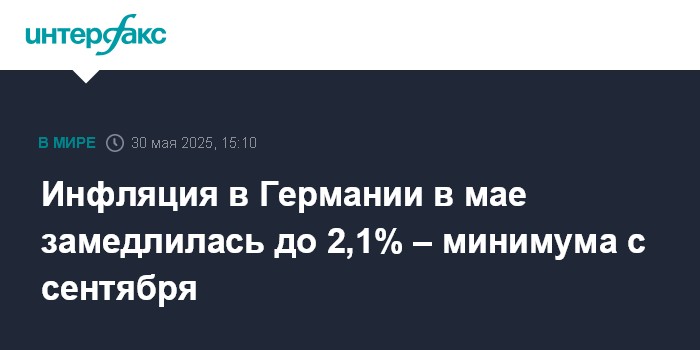 Москва. 30 мая. INTERFAX.RU - Потребительские цены в Германии, гармонизированные со стандартами Евросоюза, в мае 2025 года увеличились на 2,1% в годовом выражении, говорится в сообщении Федерального статистического управления страны (Destatis), представившего предварительные данные.