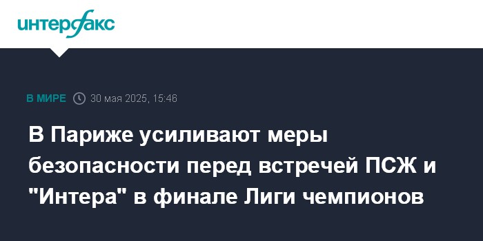 Москва. 30 мая. INTERFAX.RU - В Париже усиливают меры безопасности, чтобы избежать беспорядков после финала Лиги чемпионов УЕФА, который пройдет 31 мая в Мюнхене между футбольными командами ПСЖ (Франция) и "Интер" (Италия), сообщают французские СМИ.
