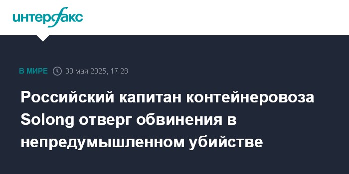 Москва. 30 мая. INTERFAX.RU - Капитан контейнеровоза Solong, столкнувшегося с американским танкером Stena Immaculate в Северном море в марте, россиянин Владимир Мотин не признал себя виновным в непредумышленном убийстве члена своего экипажа, сообщает в пятницу Associated Press.