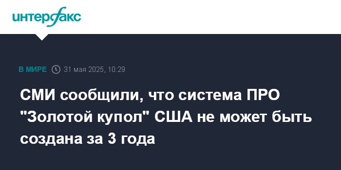 Москва. 31 мая. INTERFAX.RU - Американская программа создания противоракетной обороны "Золотой купол" (Golden Dome), которую инициировал президент США Дональд Трамп, не будет завершена к концу срока его пребывания в Белом доме, сообщила газета The Guardian, ссылаясь на осведомленные источники в Пентагоне.