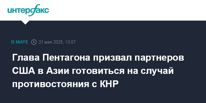 Москва. 31 мая. INTERFAX.RU - Страны Азии, поддерживающие партнерские отношения с США, должны увеличивать расходы на оборону, чтобы быть готовыми на случай противостояния с Китаем, заявил глава Пентагона Пит Хегсет.