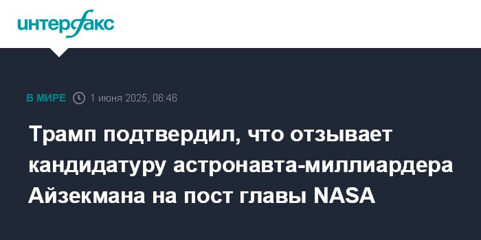 "Я отзываю кандидатуру Джареда Айзекмана на должность главы NASA", - написал президент в соцсети Truth Social и пообещал в ближайшее время сообщить о новом кандидате на эту позицию.