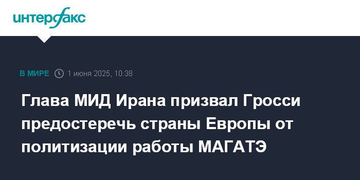 Москва. 1 июня. INTERFAX.RU - Министр иностранных дел Ирана Аббас Аракчи заявил гендиректору МАГАТЭ Рафаэлю Гросси в ходе телефонного разговора, что нельзя позволить европейским странам использовать деятельность агентства в личных целях и против Тегерана.