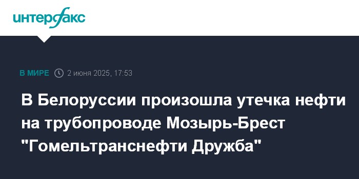 Москва. 2 июня. INTERFAX.RU - В Белоруссии произошла утечка нефти на нефтепроводе Мозырь-Брест компании "Гомельтранснефть Дружба", сообщило Министерство природных ресурсов и охраны окружающей среды.