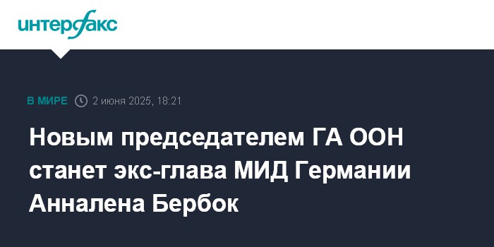Москва. 2 июня. INTERFAX.RU - Бывший министр иностранных дел ФРГ Анналена Бербок в понедельник добилась избрания новым председателем Генассамблеи ООН.