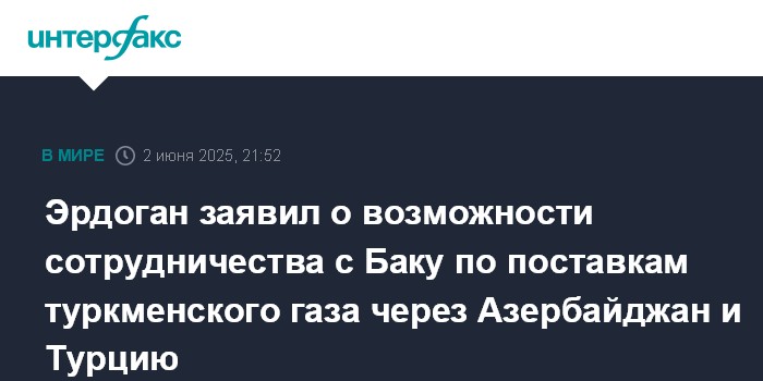 Москва. 2 июня. INTERFAX.RU - Президент Турции Реджеп Тайип Эрдоган отметил успехи и перспективы сотрудничества с Азербайджаном в энергетической сфере, заявил о возможности сотрудничества в вопросе экспортных поставок туркменского газа через Азербайджан и Турцию.
