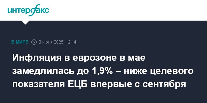 Инфляция в еврозоне в мае замедлилась до 1,9% – ниже целевого показателя ЕЦБ впервые с сентября