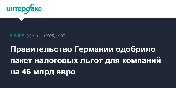 Москва. 4 июня. INTERFAX.RU - Правительство Германии одобрило пакет налоговых послаблений на общую сумму 46 млрд евро для поддержки бизнеса и экономики в целом на период с 2025 по 2029 год включительно, сообщает Reuters со ссылкой на Минфин ФРГ.