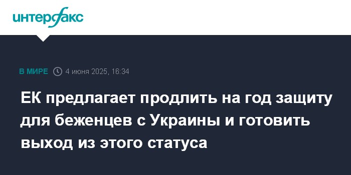 Москва. 4 июня. INTERFAX.RU - Европейская комиссия (ЕК) предложила в среду продлить временную защиту для беженцев с Украины еще на один год - до 4 марта 2027 года - и принять рекомендацию по подготовке "к скоординированному выходу" из этого статуса.