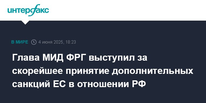 Москва. 4 июня. INTERFAX.RU - Власти ФРГ стремятся к введению нового пакета санкций ЕС в отношении России как можно скорее, заявил в среду министр иностранных дел Германии Йоханн Вадефуль.