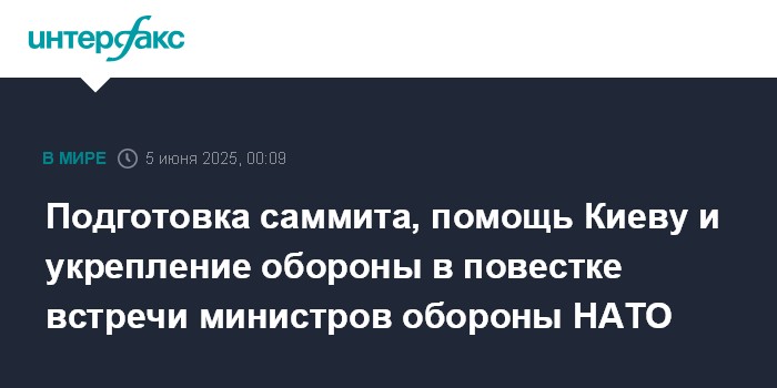 Москва. 5 июня. INTERFAX.RU - Подготовка к саммиту НАТО в Гааге 24-25 июня, поддержка Украины, укрепление сдерживания и обороны - таковы главные пункты повестки совещания в четверг в Брюсселе министров обороны стран альянса, объявил генсек организации Марк Рютте.