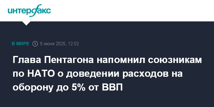 Москва. 5 июня. INTERFAX.RU - Каждой стране НАТО следует вкладывать в оборону 5% от ВВП, заявил глава Пентагона Пит Хегсет на встрече НАТО в Брюсселе. Об этом сообщает EFE.
