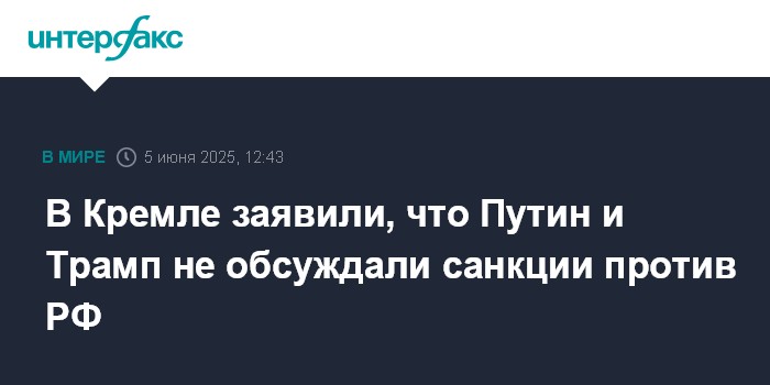 Москва. 5 июня. INTERFAX.RU - Президенты РФ и США Владимир Путин и Дональд Трамп не обсуждали смягчение или ужесточение санкций в отношении России в ходе телефонного разговора в среду, сообщили пресс-секретарь российского лидера Дмитрий Песков.