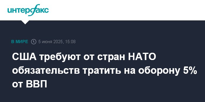 Москва. 5 июня. INTERFAX.RU - Постоянный представитель США при НАТО Мэттью Уитакер заявил, что Вашингтон требует от всех европейских стран союза, в том числе Испании, взять на себя обязательство по увеличению расходов на оборону до 5% от ВВП, сообщает газета ABC.