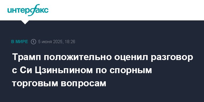 Москва. 5 июня. INTERFAX.RU - Президент США Дональд Трамп в четверг заявил, что его телефонный разговор с председателем КНР Си Цзиньпином по торговым вопросам привел к положительному результату.