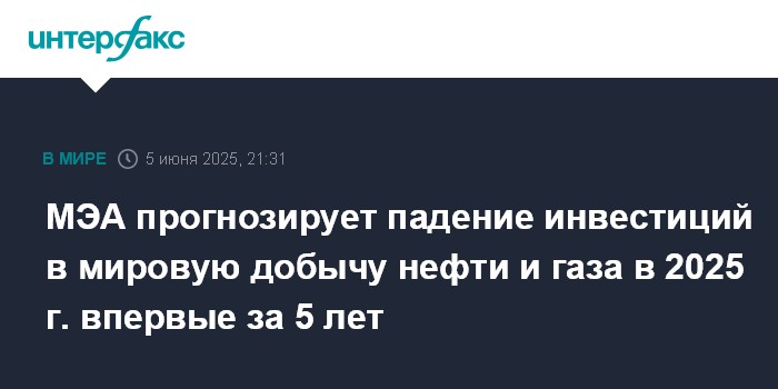 Москва. 5 июня. INTERFAX.RU - Инвестиции нефтегазовых компаний в upstream сегмент по итогам 2025 года могут снизиться впервые за последние пять лет: на 4%, до уровня чуть менее $570 млрд. Таков прогноз аналитиков Международного энергетического агентства (МЭА) в ежегодном отчете World Energy Investment.