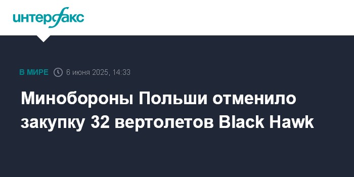 Москва. 6 июня. INTERFAX.RU - Агентство по вооружению при Минобороны Польши отменило закупку 32 вертолетов S-70i Black Hawk, заявил в пятницу пресс-секретарь агентства подполковник Гжегож Полак.