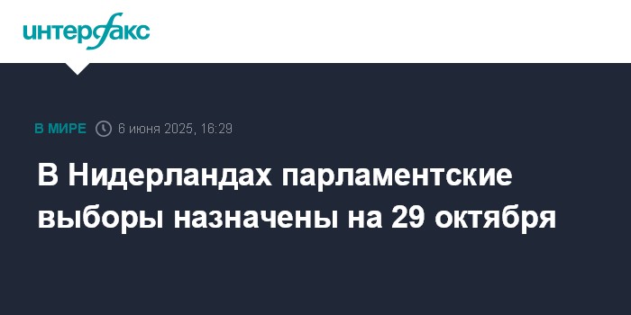 Москва. 6 июня. INTERFAX.RU - В Нидерландах досрочные парламентские выборы назначены на 29 октября, сообщила глава МВД страны Юдит Аутермарк. Об этом сообщает Bloomberg.